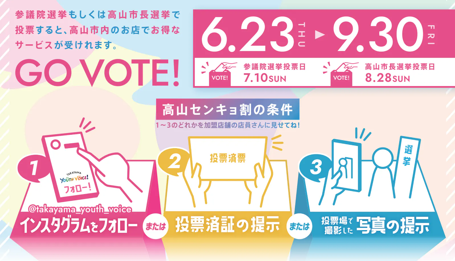 参議院選挙や高山市長選挙の実施に合わせて、政治に関心を持った方や投票した方がお得な割引を受けられるキャンペーン「高山センキョ割」などを実施しております。