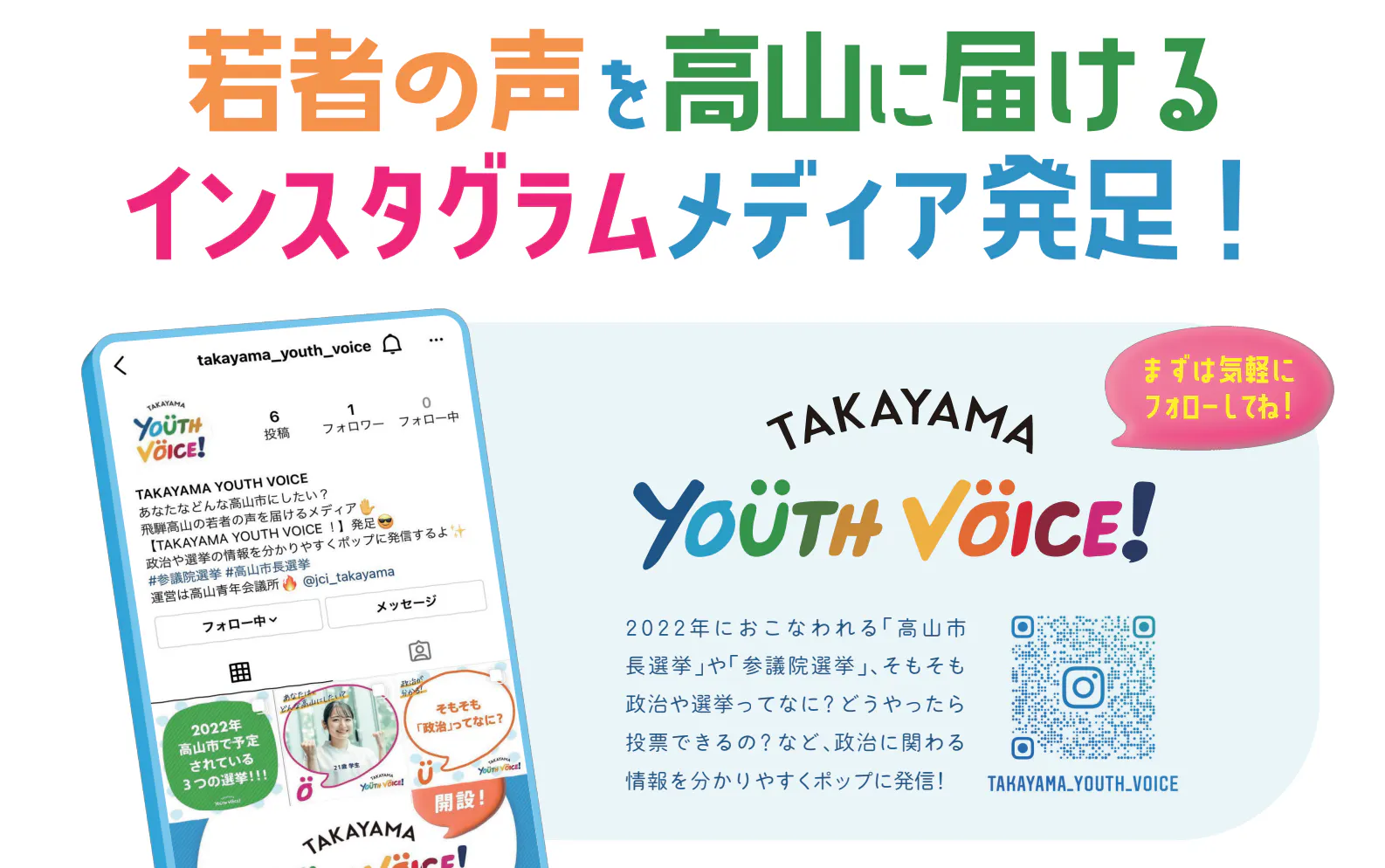 具体的には、飛騨高山の若者の声を届けるインスタグラムメディア「TAKAYAMA YOUTH VOICE」の運営や、