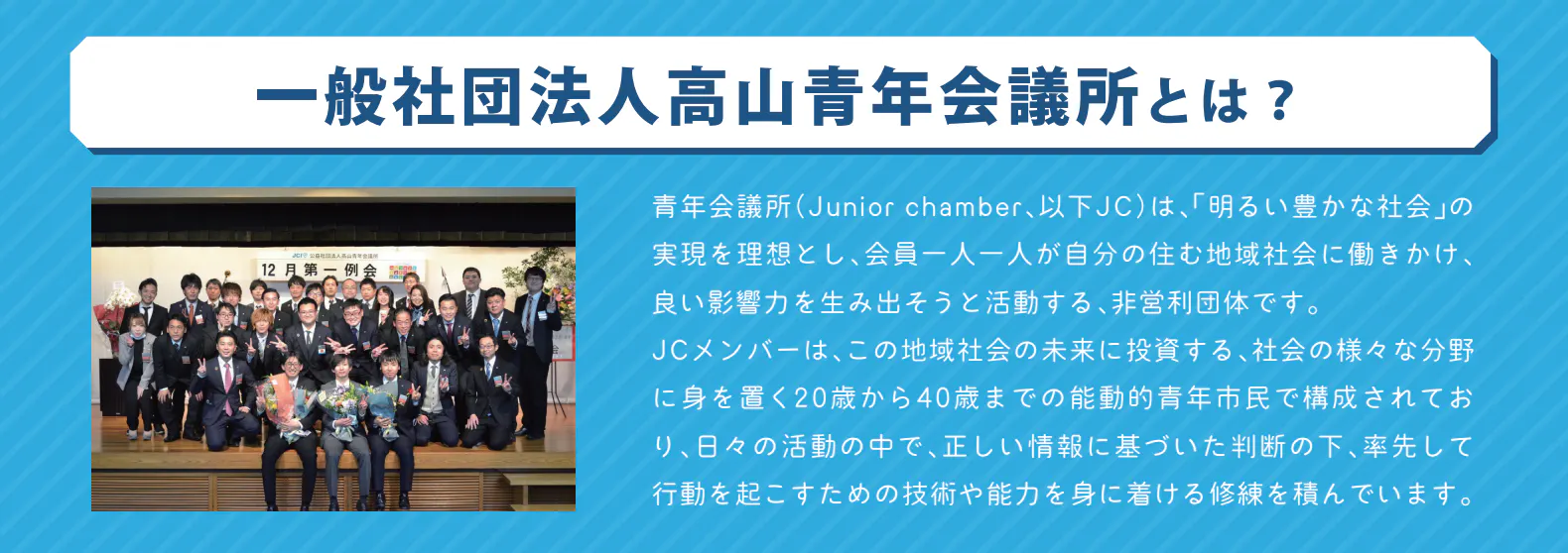 私たち一般社団法人高山青年会議所(高山JC)は、「明るい豊かな社会」の実現を理想とし、1954年の設立以来、長きにわたって高山市のまちづくりに関わり続けてきました。JCメンバーは、この地域社会の未来に投資する、社会の様々な分野に身を置く20歳から40歳までの能動的青年市民で構成されています。