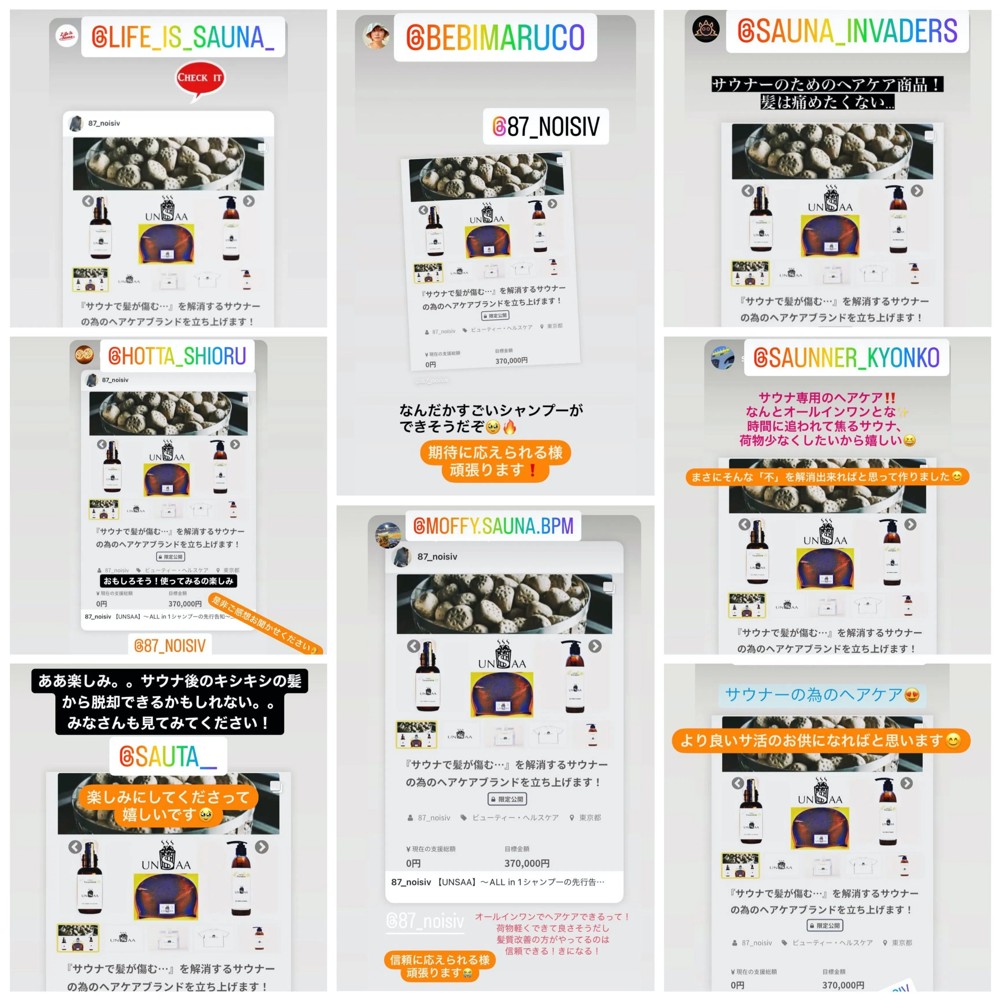 2022/07/27 00:1337日間に渡るプロジェクト期間が終わりました。皆様の御支援のお陰で目標金額を達成する事ができとても嬉しいと同時に今後期待に添えられるモノをお届けしなければとより一層身が引き締まります!ステッカー、シャンプー、Tシャツのリターンにつきましては準備が出来次第、8月より順次発送させて頂きます。インサウナトリートメントに関しましては原材料費の高騰化に伴い、開発に遅れが生じており、9月頃の発送になるかと思います。お待たせして申し訳御座いませんが、納得できる商品をお届けしたいと思っておりますので今暫くお待ち下さい。今後もUNSAA商品並びにUNSAAプロジェクトを見守って頂けますと幸いです。本当にありがとうございました!株式会社No is IV 代表取締役 花澤 祐史UNSAA制作TEAM 一同 もっと見る