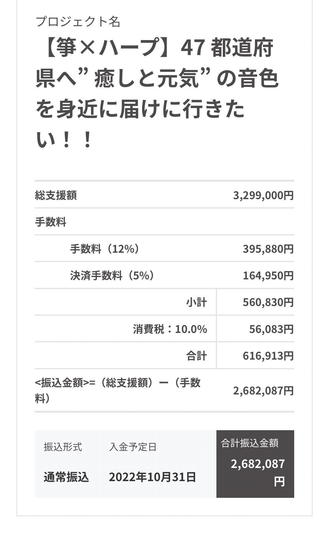 みなさまごきげんよう♪TOKUMADEのご支援本当にありがとうございました!予想していなかった目標を達成して皆様からの優しい愛を感じました(⸝⸝⸝ᵒ̴̶̷̥́⌑ᵒ̴̶̷̣̥̀⸝⸝⸝)支援して下さったお金が全て手元に入る訳では無いので詳細をご報告させていただきます。2,682,087円は大切に使わせていただきます。CD制作費/各公演広告費/交通費/宿泊費/会場費/コロナ対策費 など贅沢はできません!(しません)途中で旅費が足りなくならないようにしっかり金銭管理をしようと思います!それでは皆さん待っていてくださいね♪ハープ王子・大川義秋より