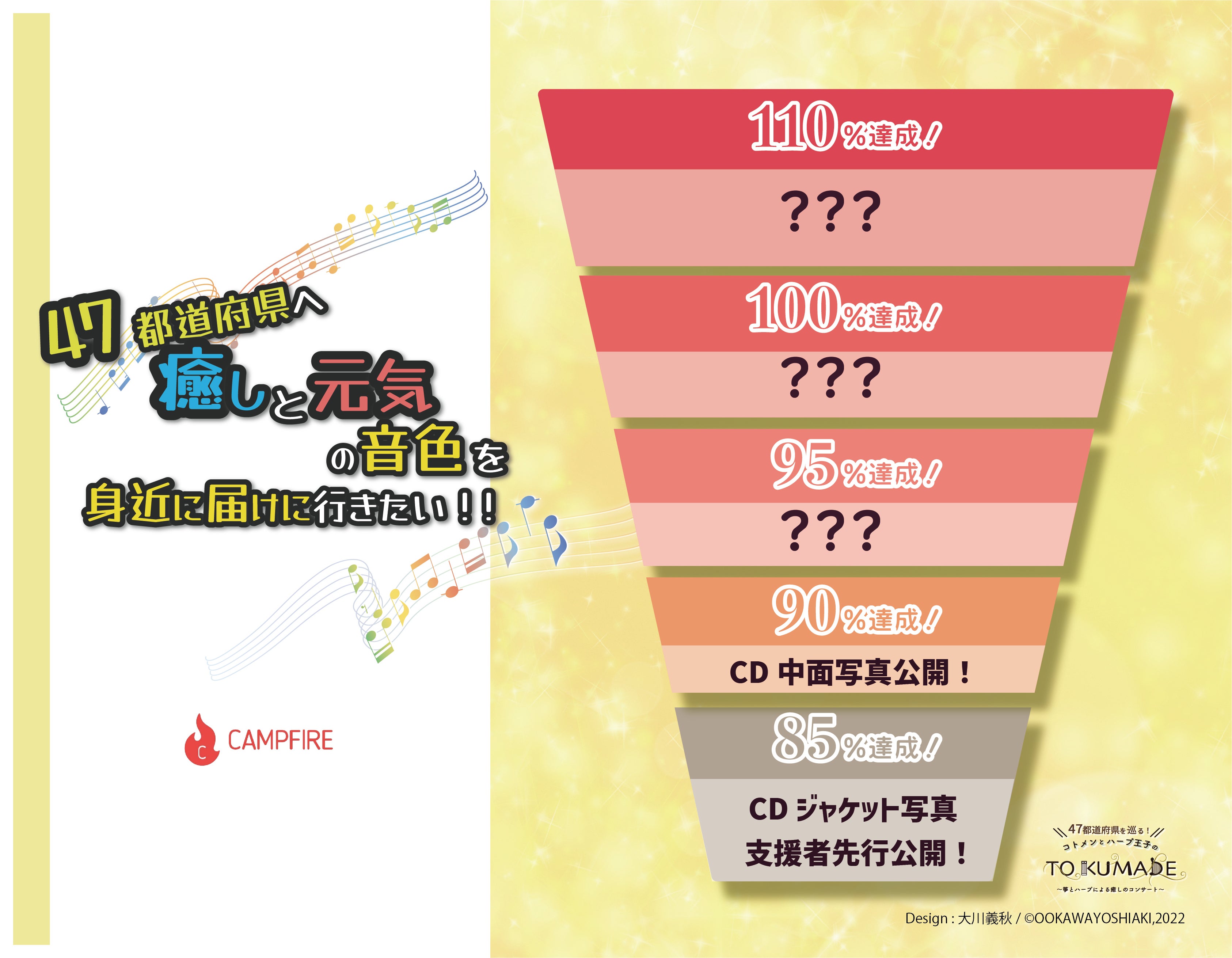 皆様遅くにすみません~ハープ王子です!先程目標達成率が95%になり嬉しくなり、皆様にお礼をすぐ言いたいと思いメッセージを書かせていただきました。95%達成記念の公開は少々お待ちください♪本日は1番遠い九州地方の演奏ミーティングをしていました!こちらもそろそろ発表出来そうですので楽しみにお待ちください♪本当にここまでのご支援、応援ありがとうございます!