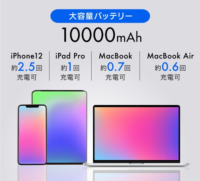 そのためポケットサイズでも【Wireless power bank】ならiPhone12 約2.5回、iPad Pro 約1回、Macbook 約0.7回、Macbook Air 約0.6回も充電可能。