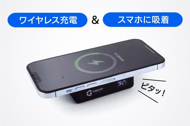 【Wireless power bank】はマグネットの力でスマホにピタッと貼り付くため、充電ポイントがズレません。(対応の機種のみ)