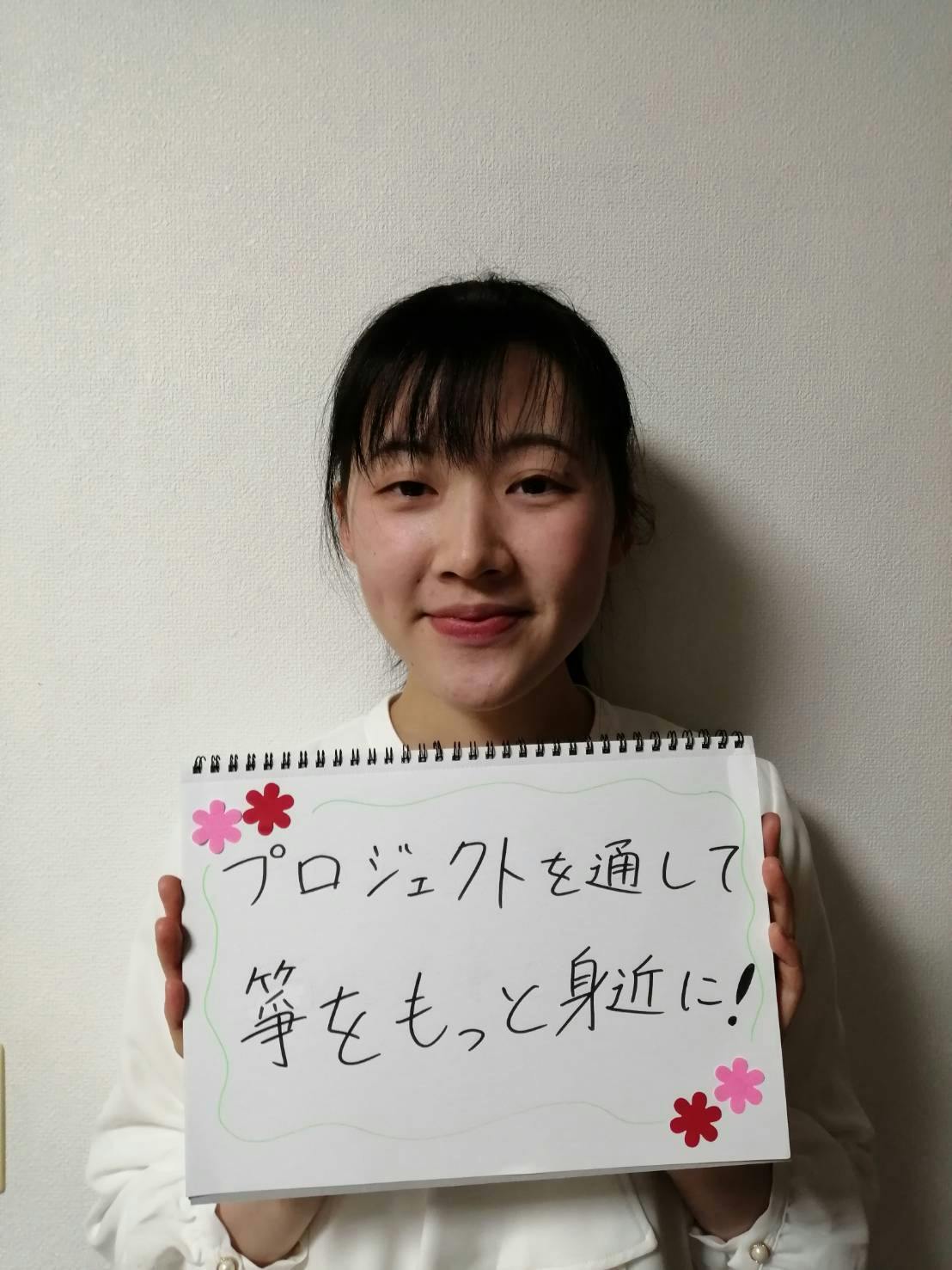 私は高校で箏曲部に所属していたため、大学生になってからもお箏に関わりたいと思い、このプロジェクトに参加しました。大学に箏曲部はなく、箏に触れたことのある友人も少ないため、多くの人にとって箏がもっと身近になってほしいと考えます!プロの箏奏者と箏未経験の学生メンバーの間に立ち、箏経験者の学生としてサポートしていけたらと思います。