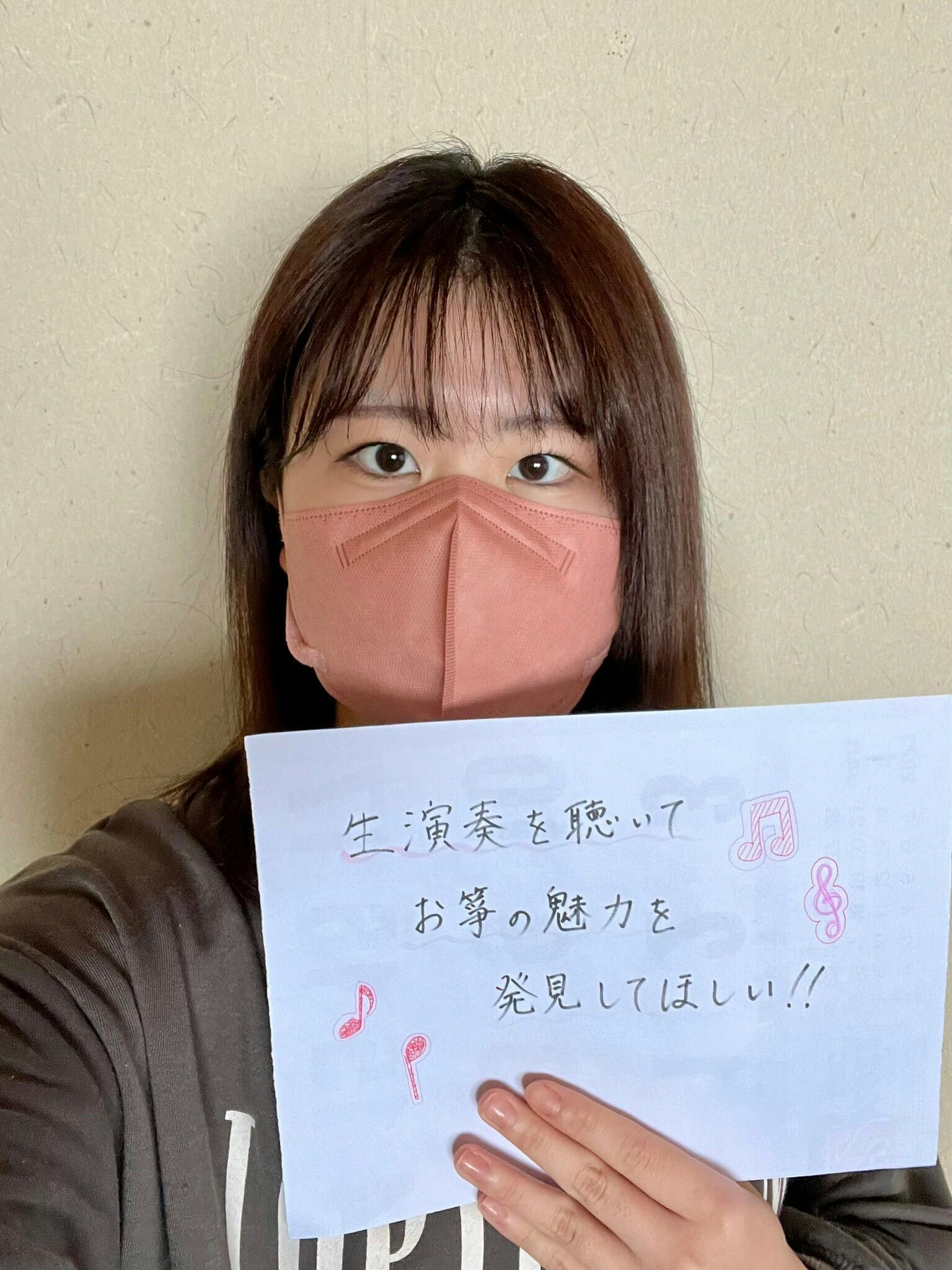 最初は、舞台制作の過程を理解し、将来に活かせたら…と考えていました。しかし、このプロジェクトに携わり、お筝に触れる機会が増えるにつれて、多くの人にお筝を好きになっていただきたいと思うようになりました。私は、特にお筝の音の余韻に魅力を感じています。ぜひ皆さんにも、kokinの生演奏を聴いていただいて、自分なりにお筝の魅力を発見していただきたいです!!