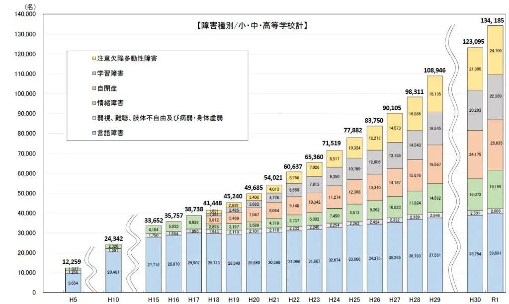 [図表]通級による指導を受けている児童生徒数の推移 出所:文部科学省『令和元年度 通級による指導実施状況調査』より