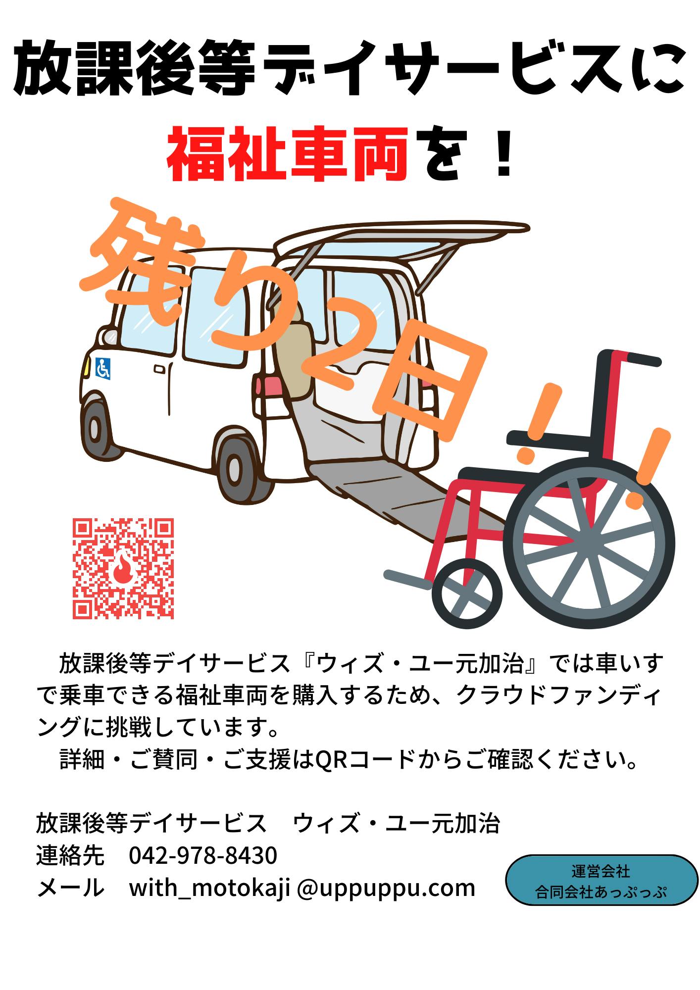 ウィズ・ユー元加治の室内はキッチン以外はバリアフリーになっており、トイレに排泄介助のためのベッドも用意しております。しかし、お迎えに行くための福祉車両がありません。児童・生徒が居心地の良い施設を自ら選び、選択権を得るためにも、施設への移動手段である福祉車両の購入のお手伝いをしていただけませんでしょうか?