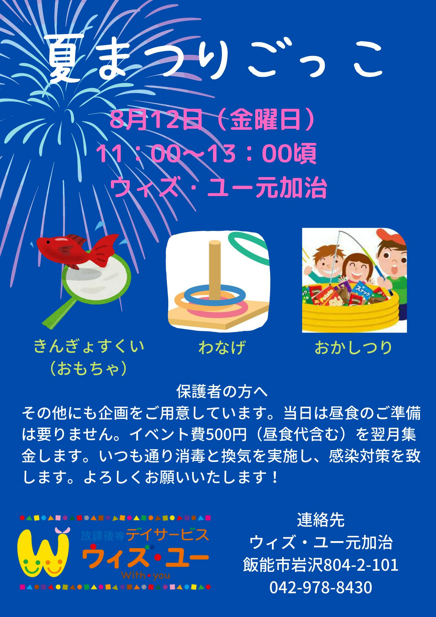 放課後等デイサービスウィズ・ユー元加治が、はじめての夏を迎えました。新型コロナウイルスの影響もあり、感染対策を行いながら、手探りで活動をしていましたが、「こどもたちが楽しめる企画を!」と思い、元々の企画は「夏まつりごっこ」でしたが、それを進化させて「夏まつり」を開催しました!