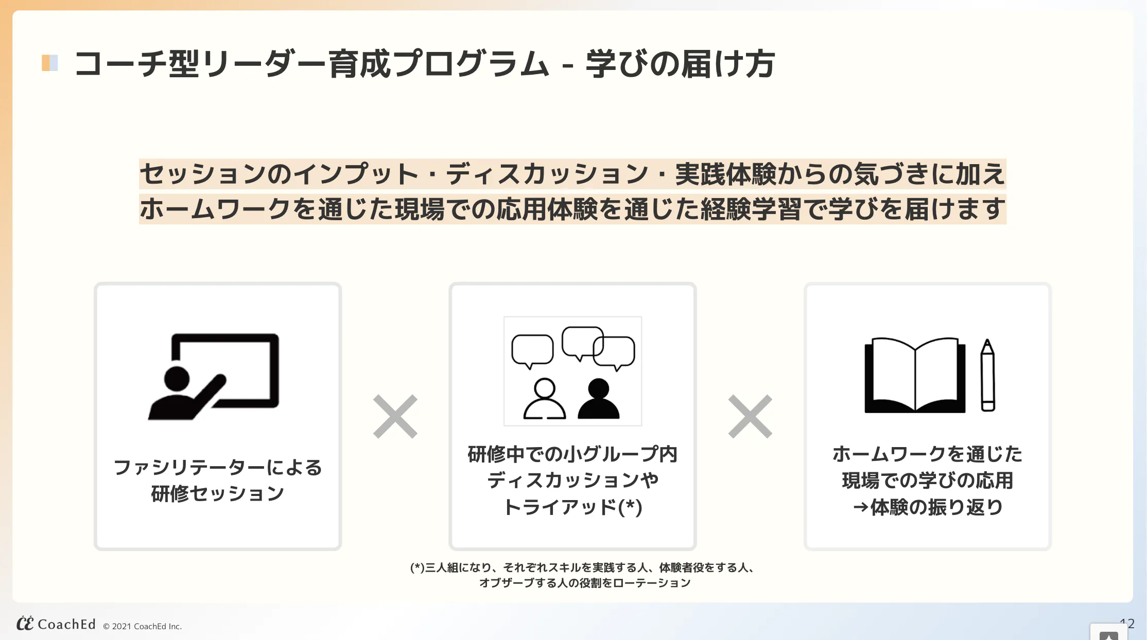 ホームワークや当日のグルーワークなど「わかる」だけでなく「できる」研修内容を用意