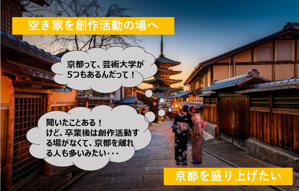 私たちは、京都に集まって来てくれるアーティストたちが、京都に留まって活動を続けられる場所を空き家問題と掛け合わせてアトリエとして今回実現したいと思っております。