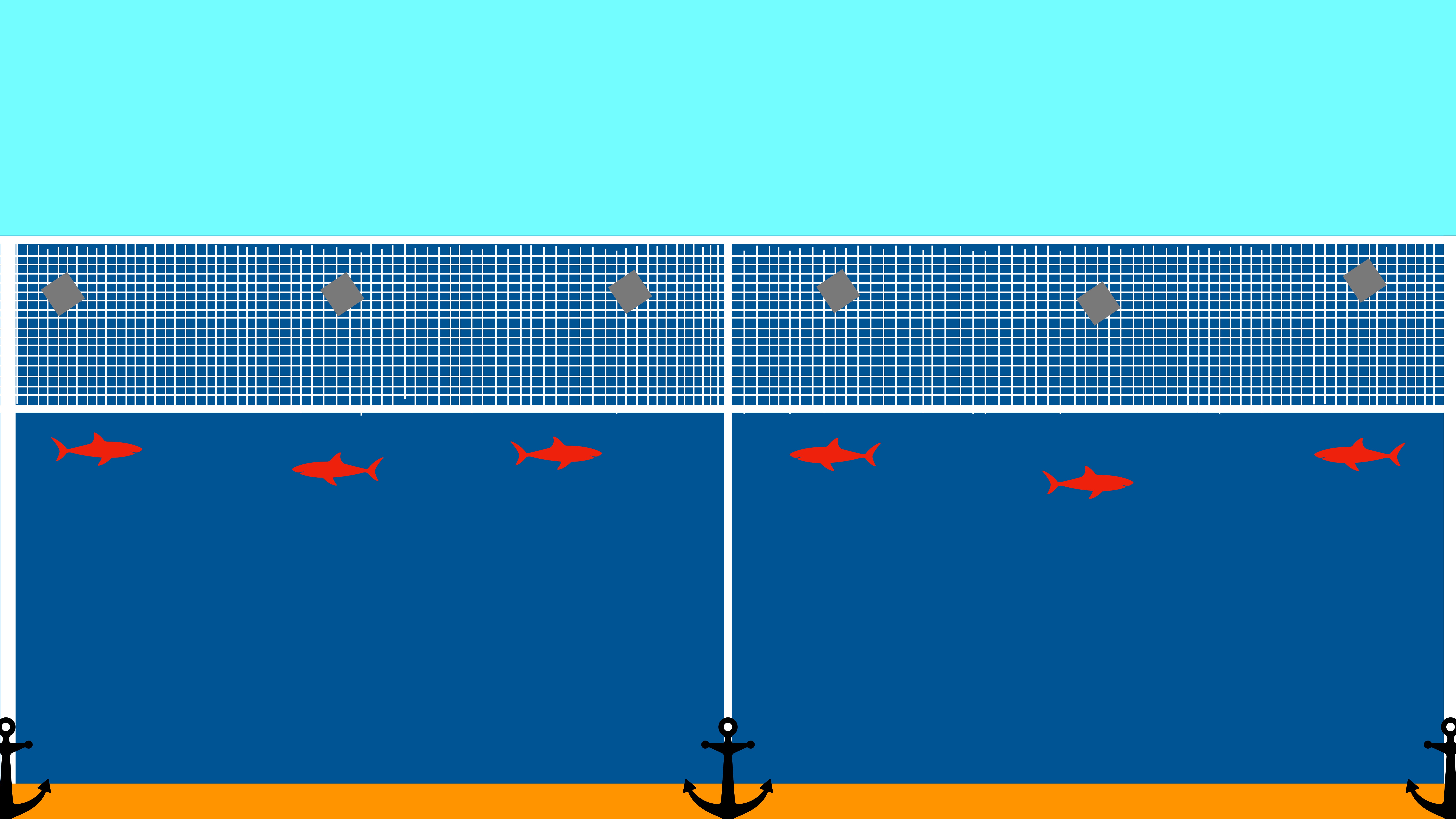 断面図(グレー=ごみ、赤=魚、白=仕掛け、水色=空、青=海)