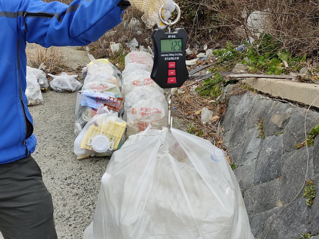 回収した海洋ごみは組成調査をしています。ごみの種類ごとに袋を分け、重さを測り、記録します。