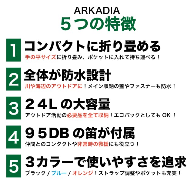 24Lの大容量設計で、アウトドア活動の必要品を全て収納でき、エコバックとして日常の買い物にもオススメです。アウトドアで色の映えるブルーとオレンジ、シックに使えるブラックの3カラーをご用意しましたので、お好きなカラーをパートナーに、アウトドアライフをより楽しくお過ごしください♪