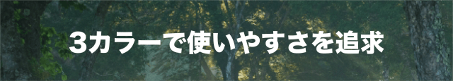 アウトドアで色の映えるブルーとオレンジ、シックに使えるブラックの3カラーからお選びいただけます。