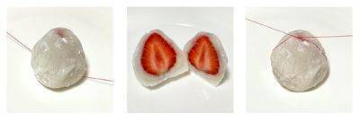 大福を半分にお切り いただくことで、新鮮でジューシーなフルーツの香りと美しい断面の様子をたのしみ、”美味しさ”を最高に高めてお召し上がりいただくことができます。