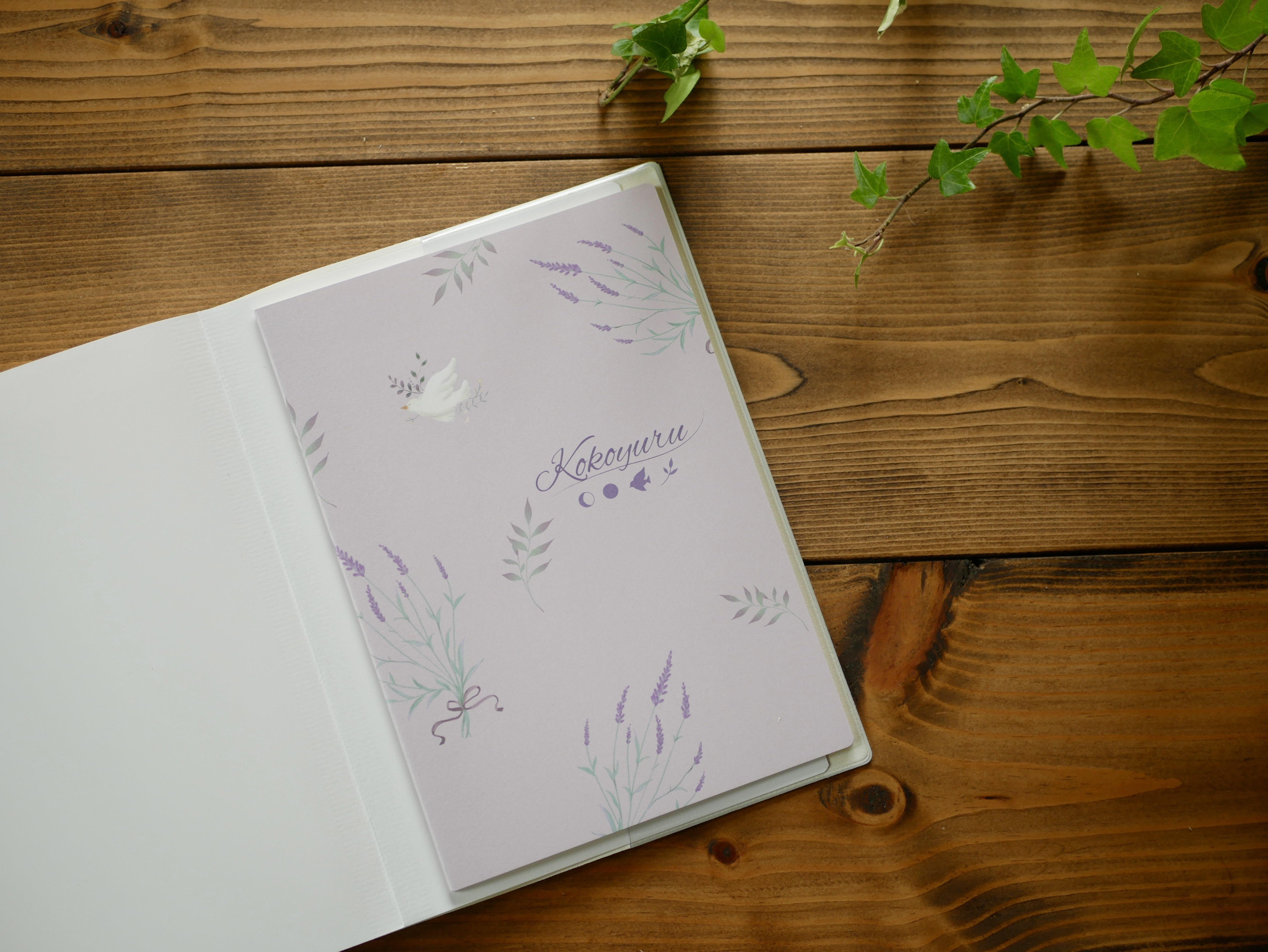 パールホワイトの手帳には、ラベンダーと鳥のデザイン。