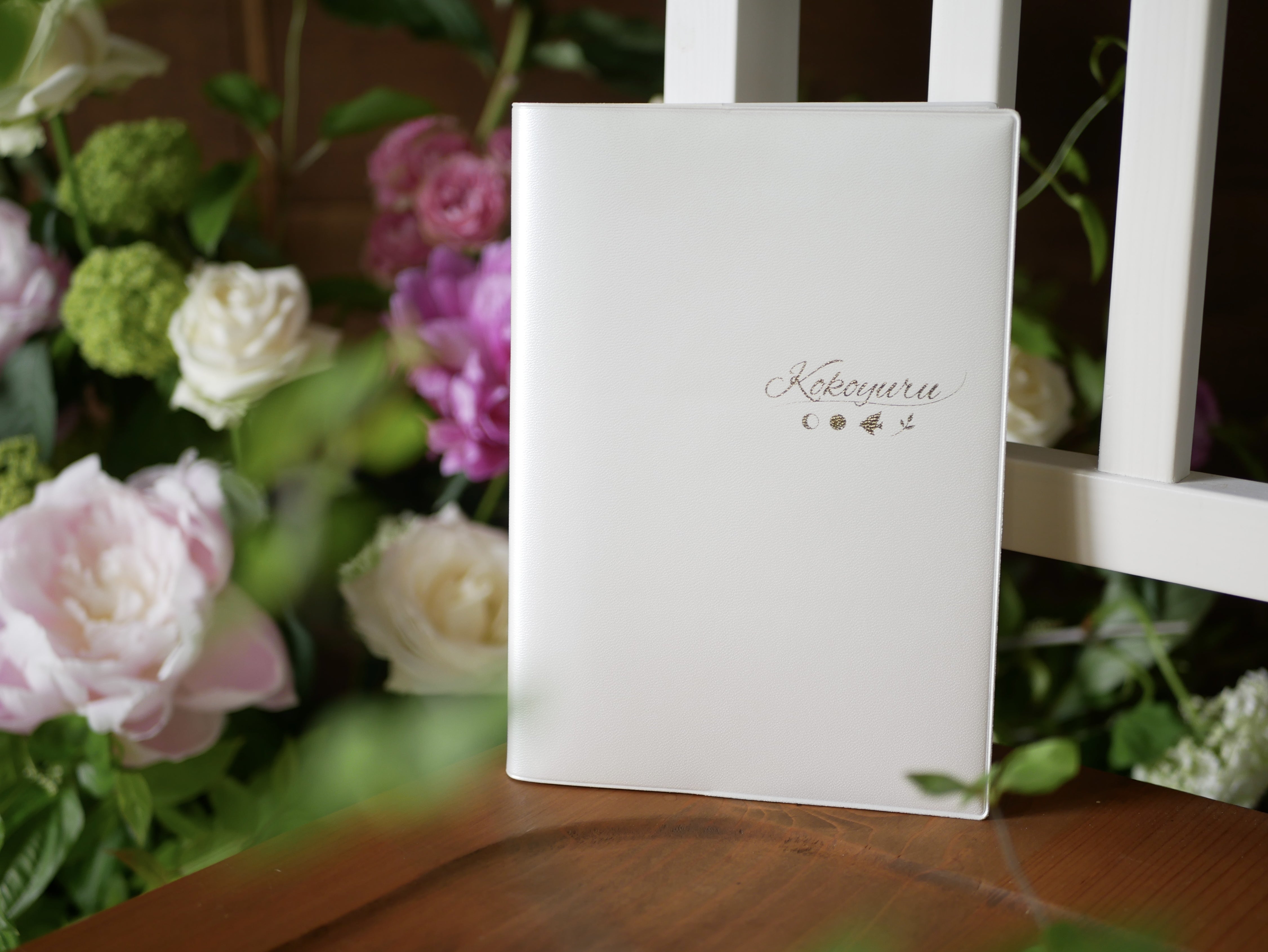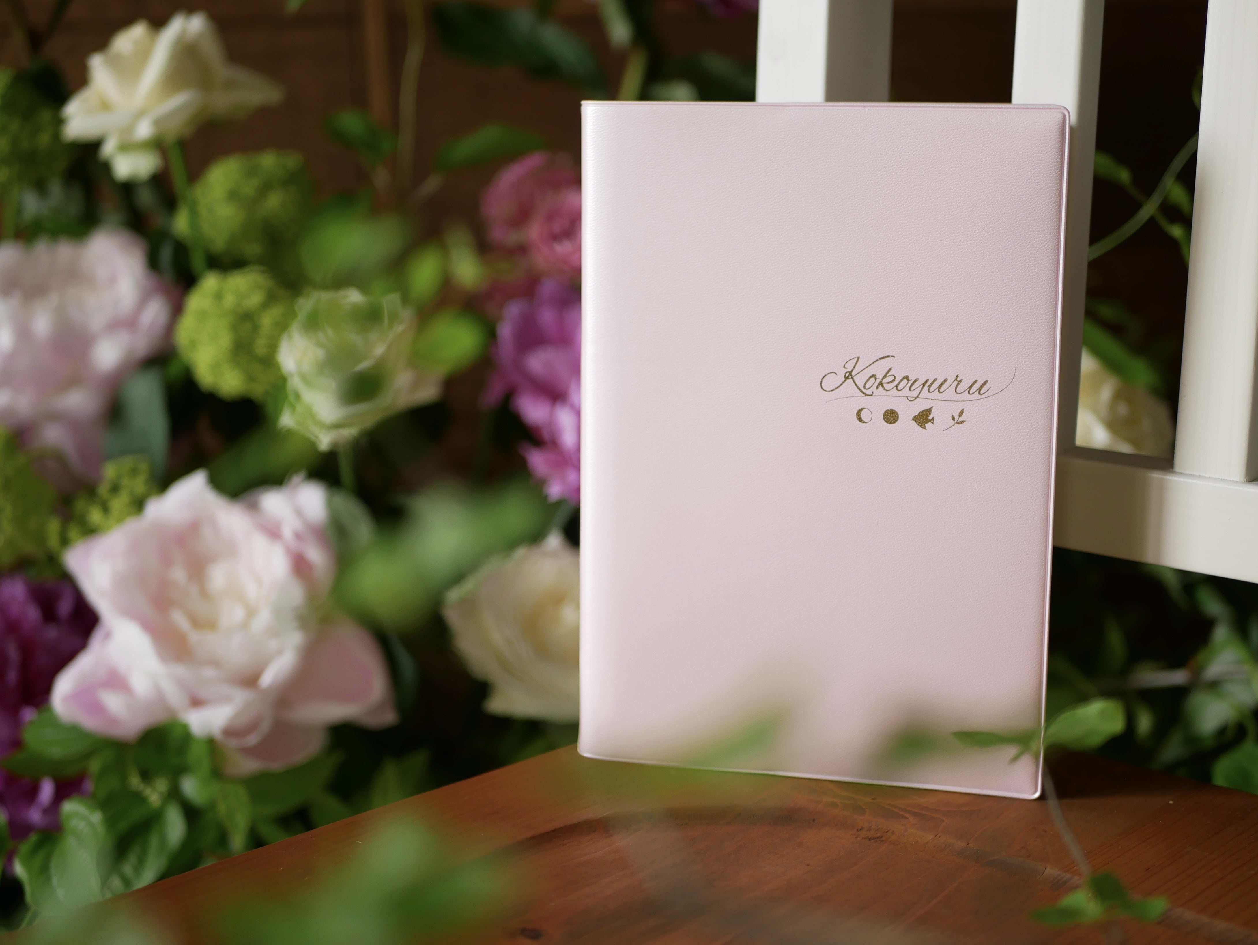 新しいここゆる手帳の表紙は誰でも馴染むシンプルで高級感のあるビニールカバー+かわいらしい大人なイラストデザインの薄型マンスリー付き。ロゴは箔押しが施されています。月の満ち欠け、恵みある植物、生命、そんなイメージを込めています。