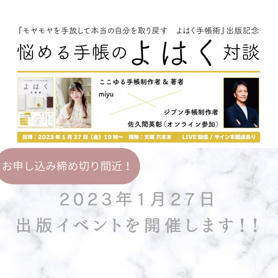 2023/01/04 11:03明けましておめでとうございます。本年も宜しくお願いいたします!突然ではありますが出版記念として、六本木にて出版イベントを開催します!「モヤモヤを手放して、本当の自分を取り戻すよはく手帳術」の出版を記念して、1/27(金)に六本木の文喫さまにて出版イベントを開催することになりました!そして、なんとビッグニュース!!あの有名な「ジブン手帳」作者の佐久間さんと対談させていただきます!スペシャルすぎますよね…ここでしか聞けない対談となりそうです…!!ぜひ参加して「手帳に対する悩みや向き合い方」を整えてみませんか?私は当日、文喫さまにてトークショーやサイン会もさせていただきます。もちろん、会場参加のみならずオンライン参加も可能です!チケットお申し込みはこちらから▼https://peatix.com/event/3453802/view皆さんにお会いできるのを楽しみにしております! もっと見る