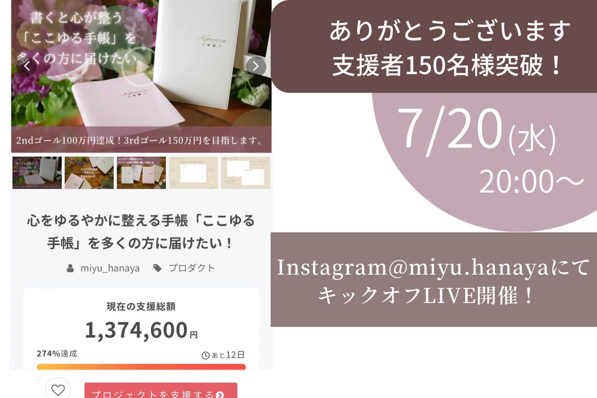 なんと支援者さんが150人になりました!本当にありがとうございます!明日、新しい報告があります。Instagram@miyu.hanayaでキックオフLIVEを開催します♪7/20 20:00〜になります。お話聞きながら手帳タイムしてくださると嬉しいです♪