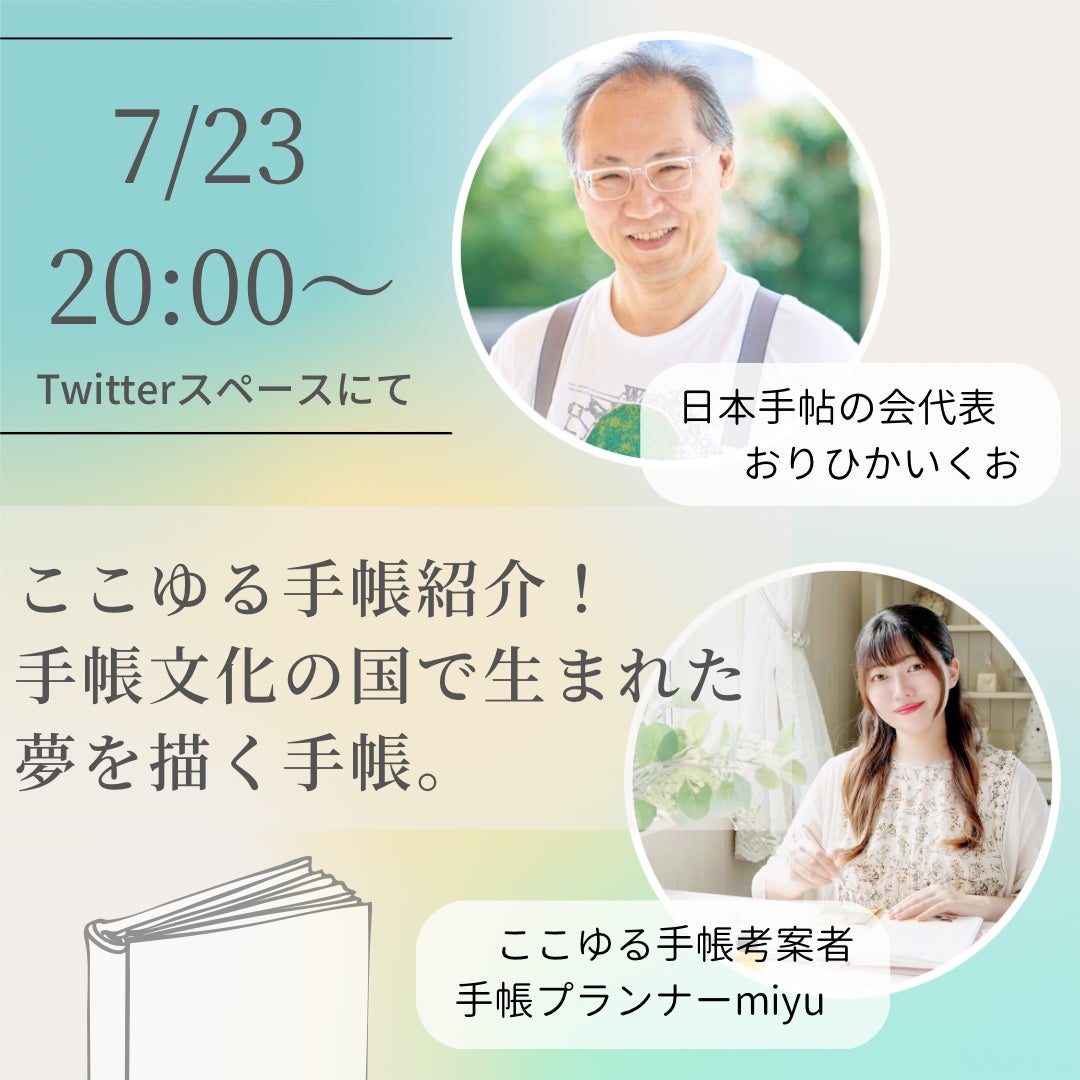 Twitterスペースにて対談します!明日、7/23 20:00〜Twitterスペースにて日本手帖の会代表のおりひかさんと対談します。テーマは「ここゆる手帳紹介!手帳文化の国で生まれた夢を描く手帳。」Twitterアカウントhttps://twitter.com/orgonitemをフォローしてお待ちください!ここゆる手帳クラファンは残りあと9日となりました!引き続き温かいご支援をよろしくお願いいたします。