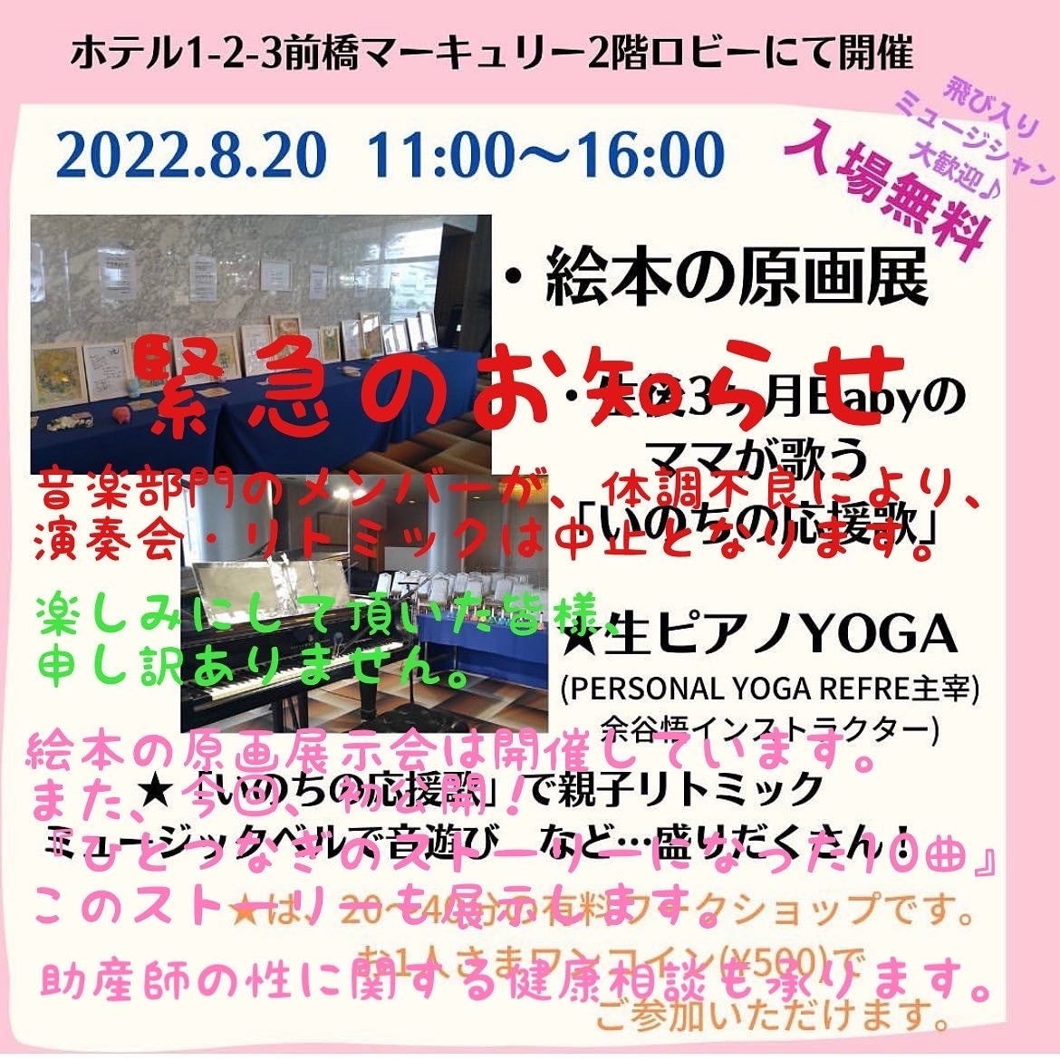 8月20日(土)に、予定していました音楽イベントですが、音楽部門担当のメンバーが、体調不良により、音楽部門(演奏会・リトミック)が中止となりました。