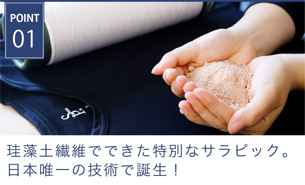 サラサラインナー「サラピック」の最大の特徴は「珪藻土を使用している」点。実は珪藻土には、水分を吸収する以外にも、消臭効果、断熱効果、接触冷感機能、保湿効果があります。高機能の珪藻土を使用してできた生地でうまれたのが、この「サラピック」です。