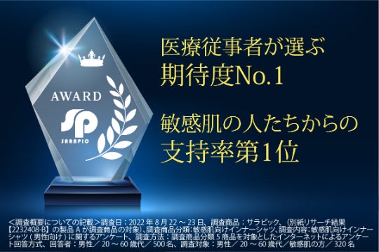 <調査概要についての記載>調査日:2022 年8 月22~23 日、調査商品:サラピック、(別紙リサーチ結果【2232408-B】の製品A が調査商品の対象)、調査商品分類:敏感肌向けインナーシャツ、調査内容:敏感肌向けインナーシャツ(男性向け)に関するアンケート、調査方法:調査商品分類5 商品を対象としたインターネットによるアンケート回答方式、回答者:男性/20~60 歳代/500 名、調査対象:男性/20~60 歳代/敏感肌の方/320 名/北海道、青森県、宮城県、山形県、福島県、茨城県、栃木県、群馬県、埼玉県、千葉県、東京都、神奈川県、新潟県、富山県、石川県、福井県、長野県、静岡県、愛知県、三重県、滋賀県、京都府、大阪府、兵庫県、和歌山県、島根県、岡山県、広島県、山口県、徳島県、香川県、愛媛県、福岡県、佐賀県、長崎県、熊本県、大分県、宮崎県、鹿児島県※回答者と回答者の同居の家族が、「出版・印刷業、マスコミ関連、調査業・広告代理業・マーケティング業、アパレル産業」に従事していない方、調査番号:2232408-B