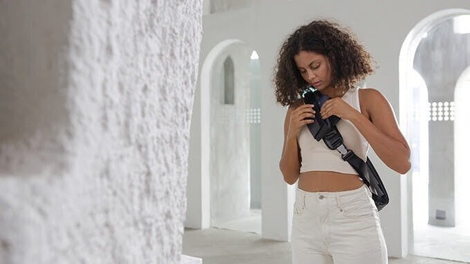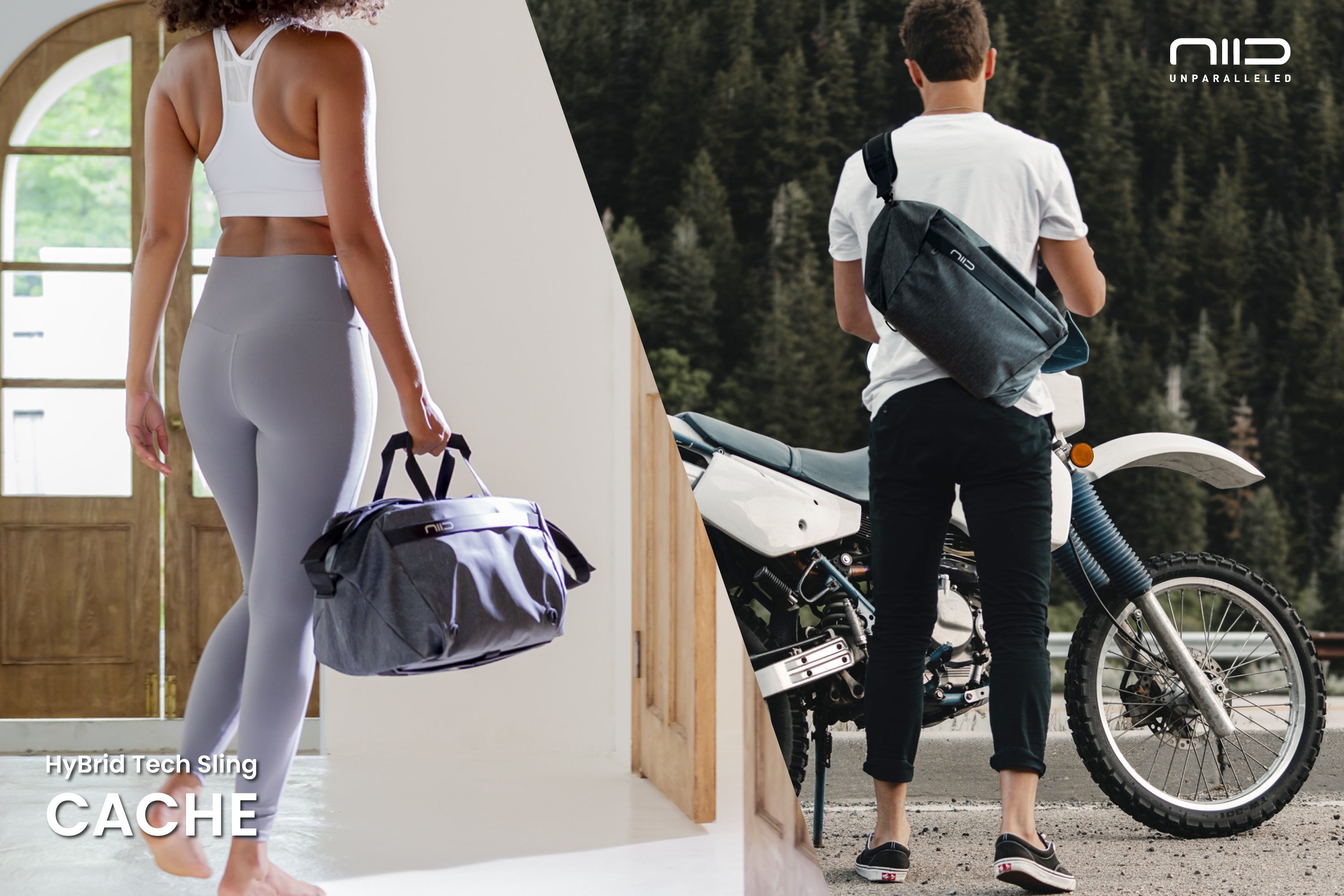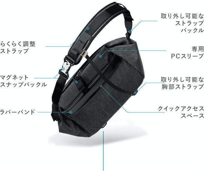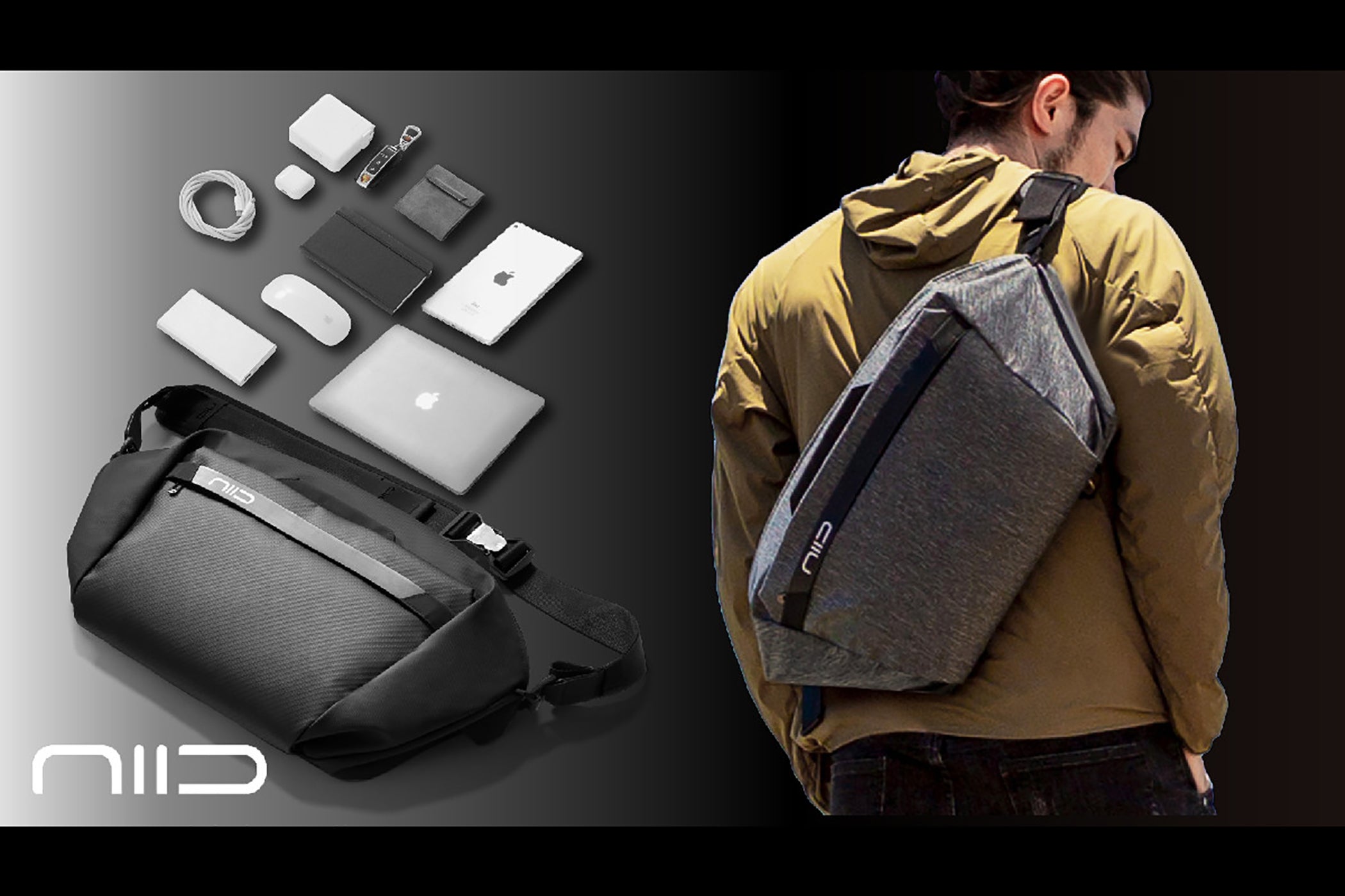 NIID CACHEは、毎日の必需品を持ち運ぶためにデザインされており、PCコンパートメントも備え、スリングの状態でもラップトップを持ち運べます。