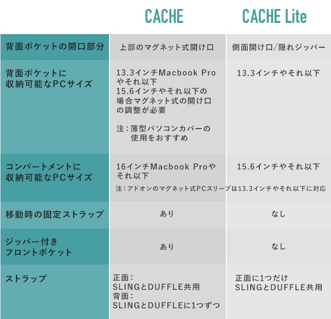 CACHEとCACHE Liteの比較表