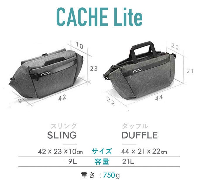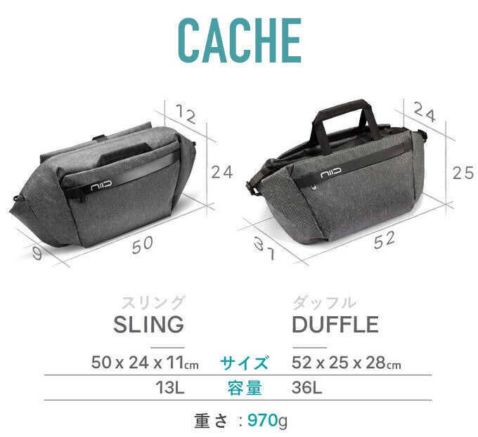 スリングとダッフルを自在に切り替えることで、日常のちょっとしたお出かけから、小旅行まで、NIID CACHEひとつで完結するのが魅力です。
