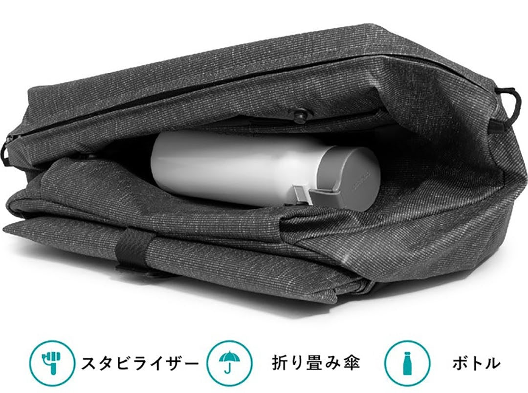 まず、メインコンパートメントとPCポケットの間には、ハーフオープンの収納スペースがあります。ボトルや折りたたみ傘などすぐにアクセスしたいものや、少し厚みのあるかさばるアイテムを収納するのにオススメです。