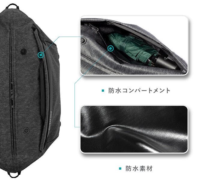 ダッフルモードに切り替えると、防水コンパートメントが新たに出現。濡れた傘やボトルを入れておくのに便利なポケットです。