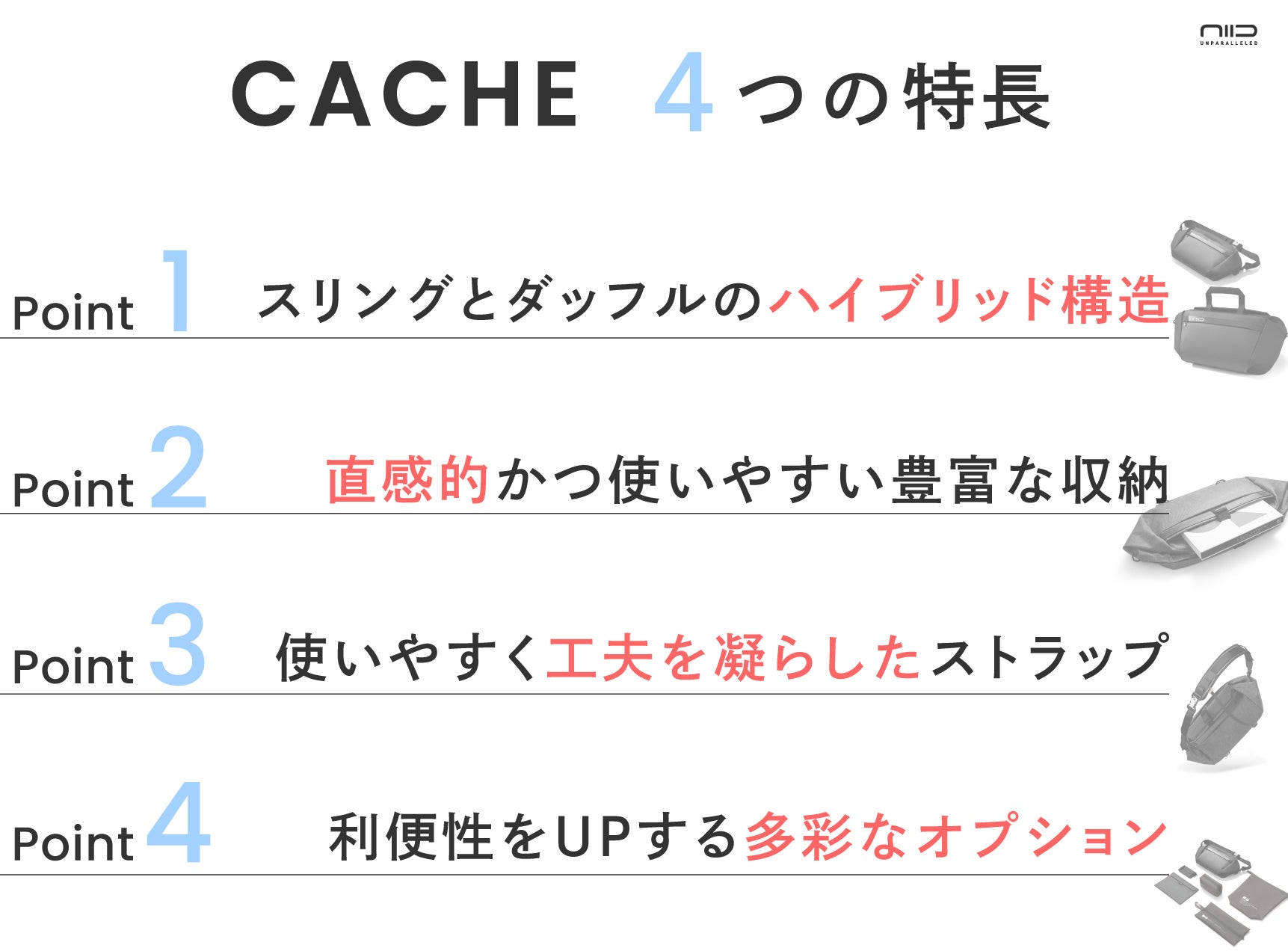 NIID CACHEを発表するにあたり、その利便性をさらに向上させるオプション品を3種(5アイテム)をご用意しました。