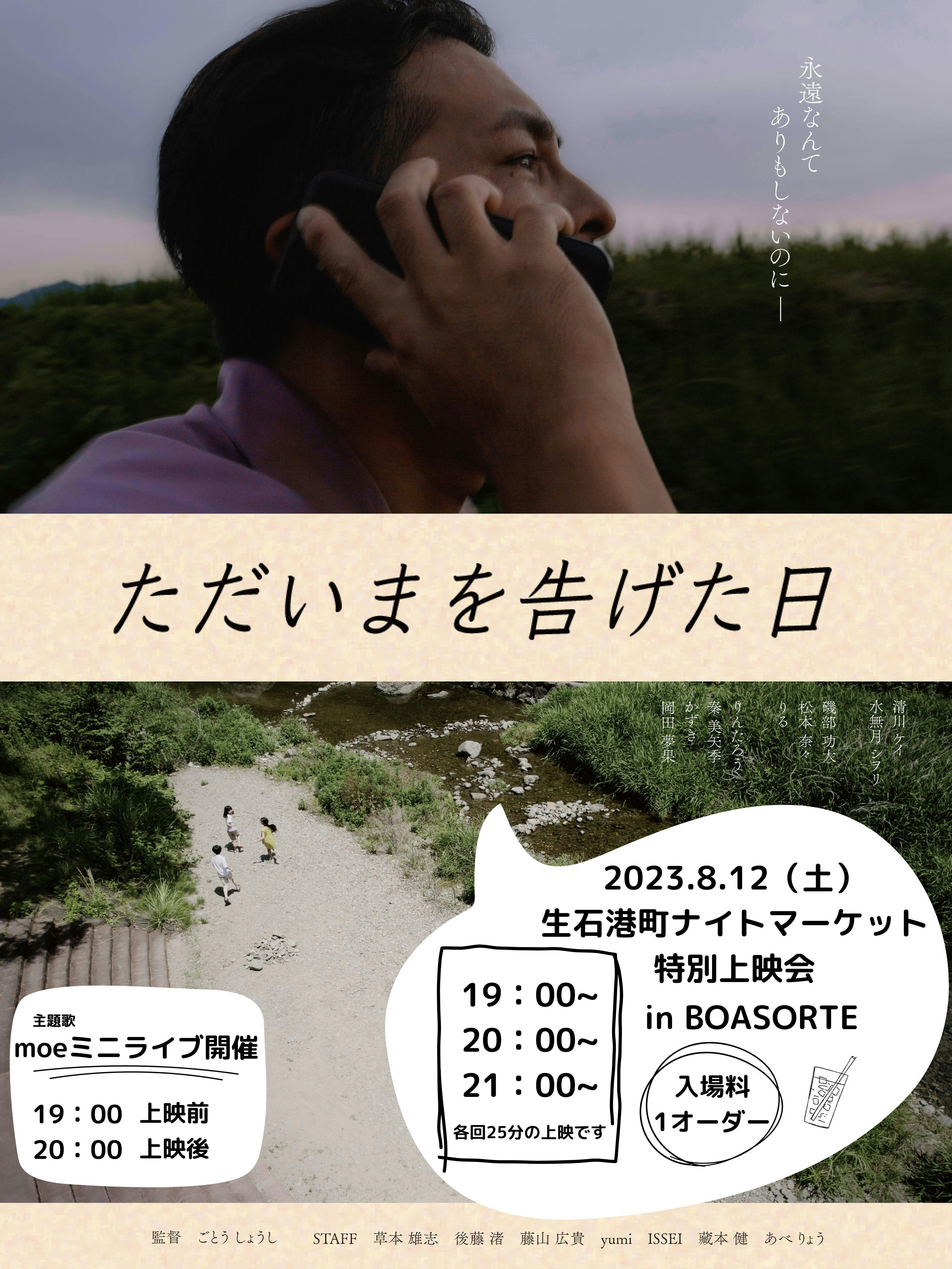2023/08/06 14:57大変お待たせいたしました。CDプランでご支援いただきました皆様へ、moeさんより楽曲提供していただいた主題歌「ただいまを告げた日」収録のオリジナルCDを発送致しました。ジャケットへの直筆サインはもちろん、なんとmoeさんからのメッセージ付きです!クリックポストでのお届けとなりますので宜しくお願い致します。そして!GOODLUCKS!の各種SNSでは告知をさせていただいておりましたが2023年8月12日(土)‟生石港町ナイトマーケット”にて「ただいまを告げた日」の上映会を行わせていただきます!上映は 19:00、20:00、21:00 の計3回上映時間は25分です場所は大分のおしゃれカフェ BOASORTE(ボアソルチ)さんです-大分県大分市生石港町2-5-10-当日はBOASORTEさんを含む周辺の店舗さんがナイトマーケット特別仕様で営業されるそうで、お天気が良ければ外でビアガーデンも楽しめるというなんとも楽し気なイベントです更に当日はmoeさんのミニライブも行います!19:00上映前と20:00の上映後に、今回の主題歌を含め数曲披露していただく予定となっています入場料は1オーダー制ということで、涼しい店内で美味しい飲み物や食事をお楽しみいただきながらゆっくり鑑賞いただけます。近くにお住まいの方、お盆で大分に帰省予定の方、連休でちょっとお出かけしようか悩んでいる方、、、ぜひとも“生石港町ナイトマーケット”へ遊びに来てください宜しくお願い致します! もっと見る