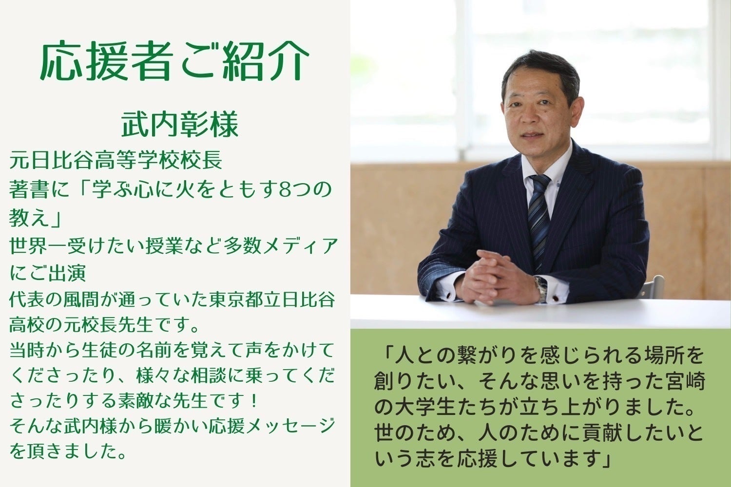 人との繋がりを感じられる場所を創りたい、そんな思いを持った宮崎の大学生たちが立ち上がりました。世のため、人のために貢献したいという志を応援しています。