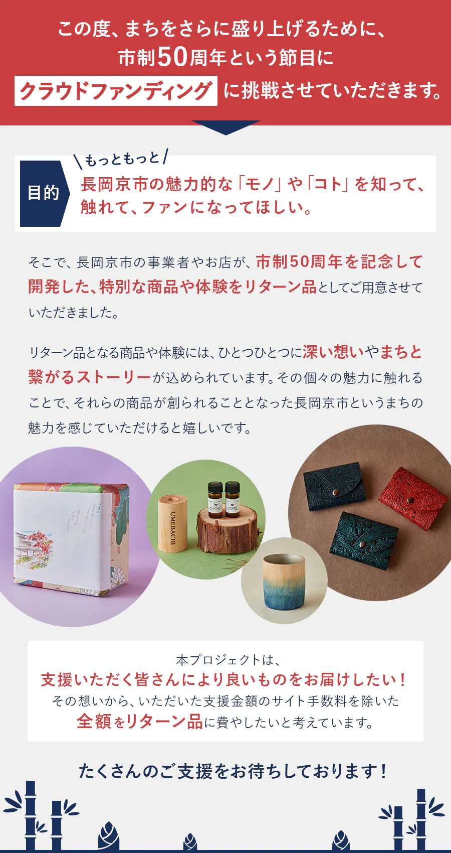 今回この想いに賛同してくださった長岡京市の事業者やお店が、市制50周年を記念して、特別な商品や体験をリターン品として開発してくださいました。今回ご用意させていただくリターン品には、ひとつひとつに深い想いやまちとつながるストーリーが込められています。ぜひこうした想いやストーリーを通して、“かしこ暮らしっく”な長岡京市というまちの魅力を知って、触れて、ファンになってもらえると嬉しいです。