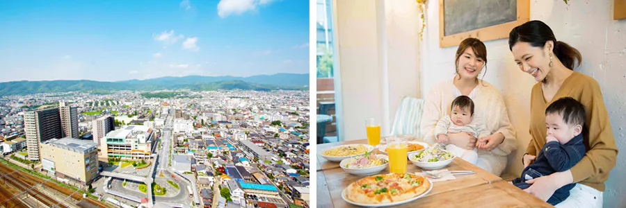 JRと阪急の2WAYアクセスで、京都と大阪にもすぐに出られる利便性。通勤はもちろん、休日は市内インターチェンジから遠方へのお出かけも楽々です。市域のどこからでも自転車やバスで駅に行けるコンパクトなまちは、スーパーや病院も多くてとっても便利。途切れのない子育て支援により、安全安心な環境の中で子どもが良質な教育を受けられます。