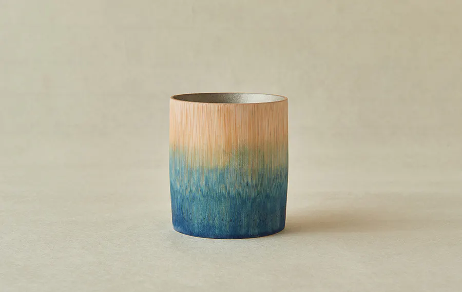藍染によるグラデーションと錫蒔地の繊細な煌めきが華やかな格調高い竹のカップです。良質の真竹の皮を削り、木目を生かして丹念に仕上げました。「京藍」と呼ばれるかつて京都の洛外で栽培され品質の高さで人気だった藍を、京都・洛西の地で復活させた職人の手によって染め上げています。軽く丈夫で、熱い液体を入れても磁器や陶器のように手元が熱くならず、保温性にも優れており、ホットでもアイスでもお使いいただけます。