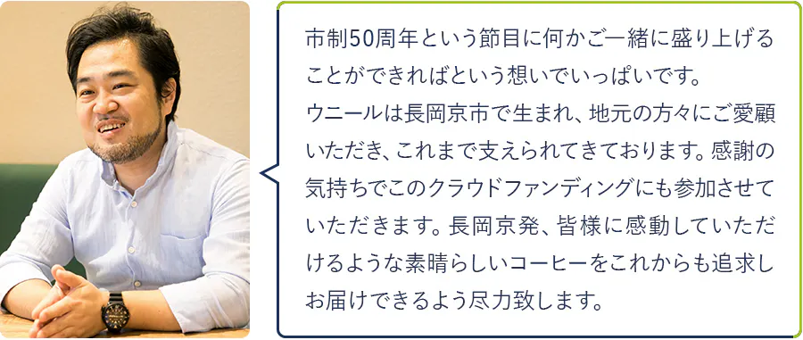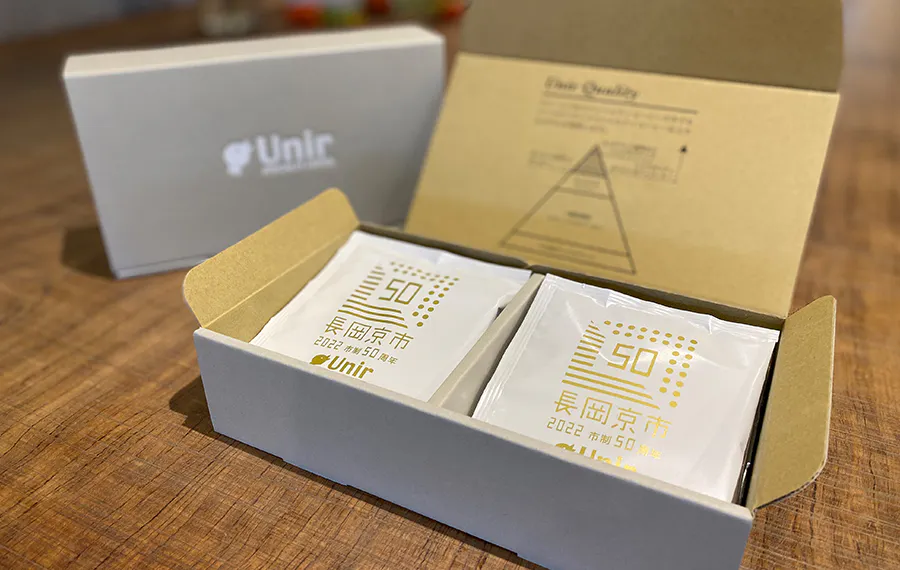 市制50周年を記念したオリジナルブレンドのドリップバッグ。数量限定製造・50周年ロゴ入りパッケージです。ご自宅でも外出先でもお湯さえあればお気軽にウニールのコーヒーをお楽しみいただけます。持ち運びも軽く、賞味期限も半年間あり、ギフトにも人気です。今しかない長岡京市の手土産としてもおすすめ。