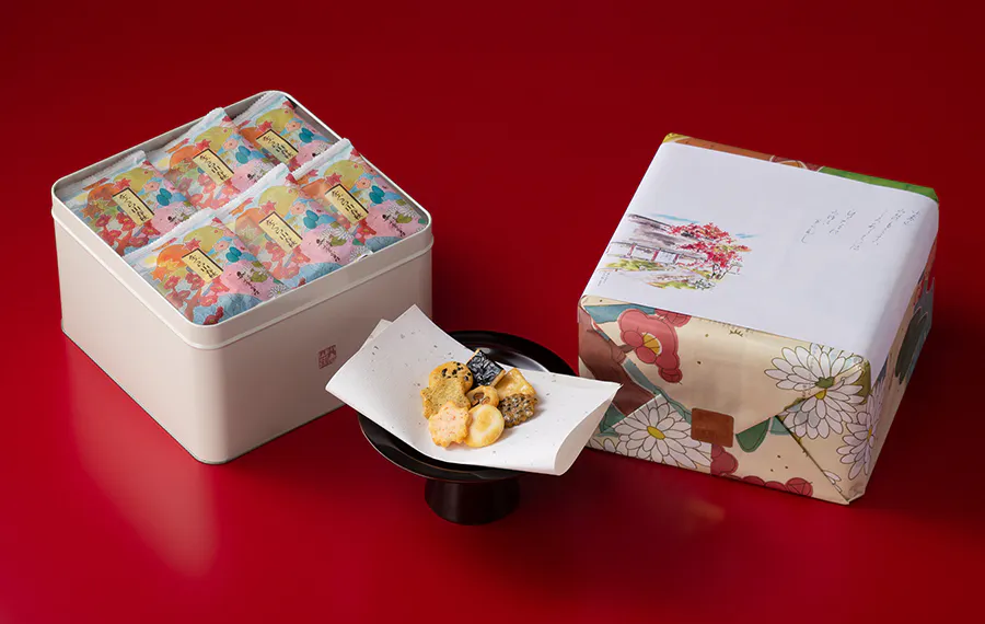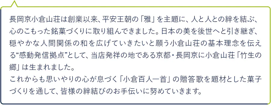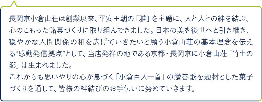 和歌の世界に想ひを馳せて。長岡京小倉山荘の代表菓である「をぐら山春秋」。小さなあられに「小倉百人一首」の世界観と日本の四季の美しさを込めた一品です。もみぢや月など季節や自然を表現した形。有明海産の海苔をちりばめた甘醤油、風味豊かな海老や黒ごまなど、八趣のあられに表現した美しさと平安情趣ある味わいをぜひご堪能ください。今回のクラウドファンディングの特別企画として、竹生の郷本館限定デザインの掛け紙をご用意させていただきました。いつもの「をぐら山春秋」とは違った、本館ならではの風情をぜひ感じていただければ幸いです。