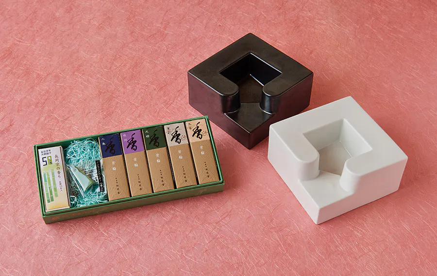 長岡京の風に揺れる爽やかな竹林をイメージして開発したオリジナルの香り「長岡京の香り」と、全国の料亭や旅館でも使われている伝統的な香りのシリーズ「芳輪」をアソートにしました。白檀の華やかな甘さや、沈香の気品の高い和の香りをお楽しみください。セットの磁器製香炉は機能性と共に、簡潔な存在感があります。お香の灰や、たきがらが捨てやすい構造です。可愛らしく、持ち上げやすい形の「つまみ香立」と一緒にご利用ください。