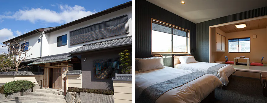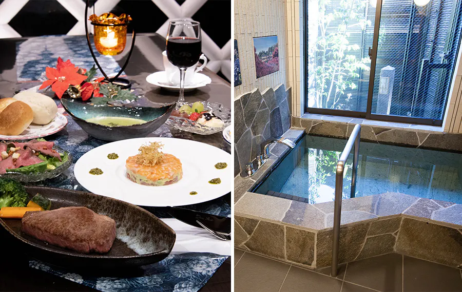 玄関をくぐった瞬間から竹の香りに心癒される特別な時間をお愉しみください。お食事は京丹波いづつや自慢の肩ロースステーキとシーフードをメインに長岡京のタケノコを使った前菜やサラダ、長岡京市制50周年のためにご用意した特別なコースディナーを、ご朝食は焼き立てパンのフルブレックファストをお召し上がりいただけます。滞在中は、「竹炭」を使った貸切風呂やお食事後のバータイムも。ぜひ特別な日の特別な一日を堪能してください。