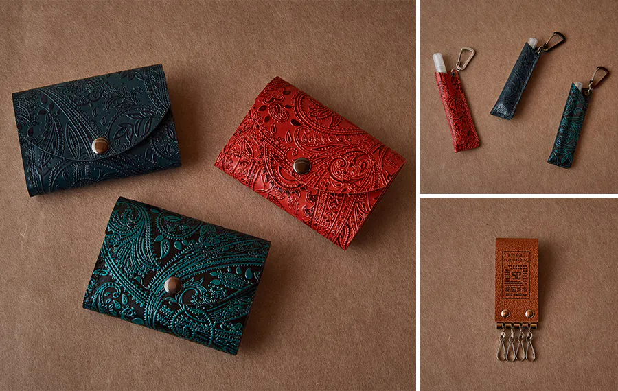 小型の割には、お札も小銭もカードも入るちょっと便利なお財布。手縫いで丁寧に仕上げられています。柄は、ペイズリー柄で、カラーは赤、青、緑のいずれか。またセットとして、キーホルダーかケース入り消毒スプレーのいずれかの革小物をお選びいただけます。