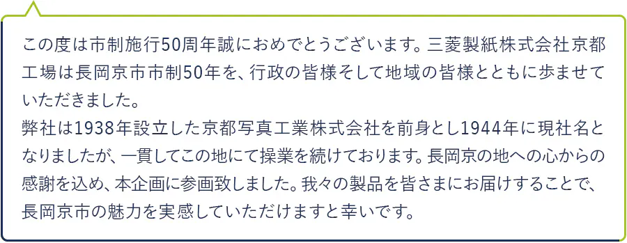 国内9カ所の生産拠点を有する総合製紙メーカー。長岡京にある京都工場は約80年操業を続けている。主要製品は、写真感光材料、印刷製版材料、インクジェット用紙等。近年は、これまで培ってきた技術を生かし、エレクトロニクス分野、ヘルスケア分野等で特徴的な新製品の開発にも取り組んでいる。