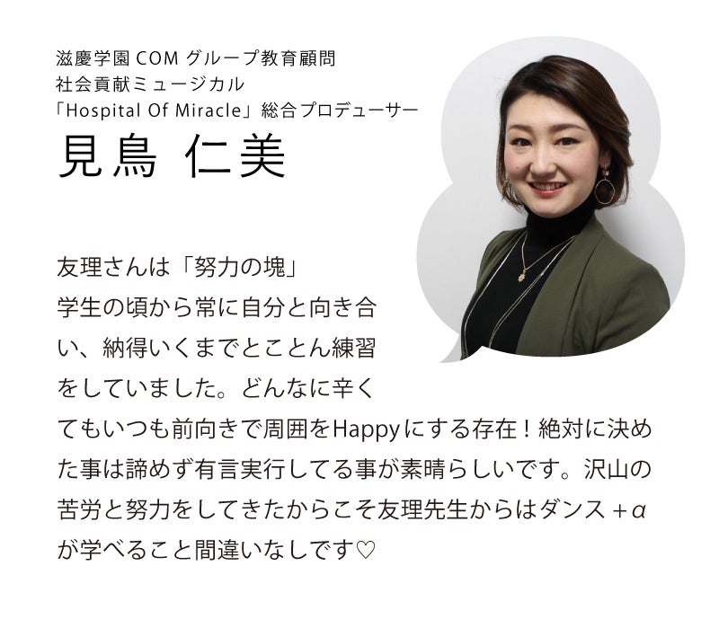 現在は育児をしながらダンスインストラクターとして、ダンスの楽しさと夢を実現することの素晴らしさを伝える活動をしています。