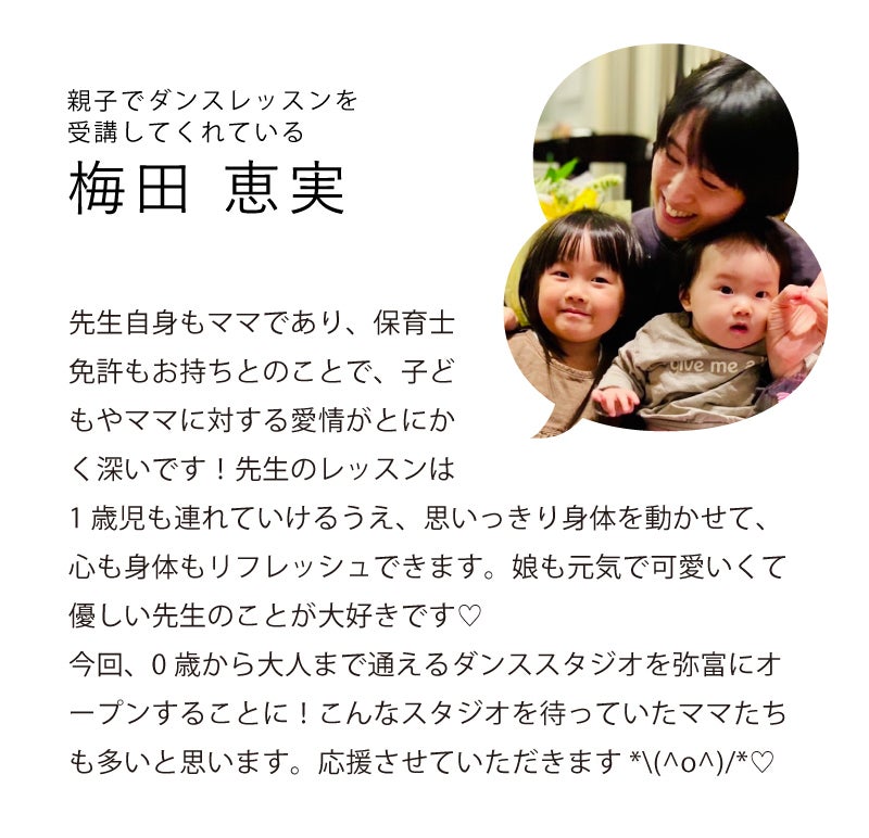 また、私自身ママとしてコロナ禍で支援センターへも行きづらかったり、なかなかママ友ができなかった経験があり、ママや子どもたちがただダンスを学ぶだけでなくダンス以外のイベントやママ同士が繋がって話ができる、そんなママたちのリフレッシュできる場所が近くにほしいと考え自らのスタジオを作ることを決意しました。