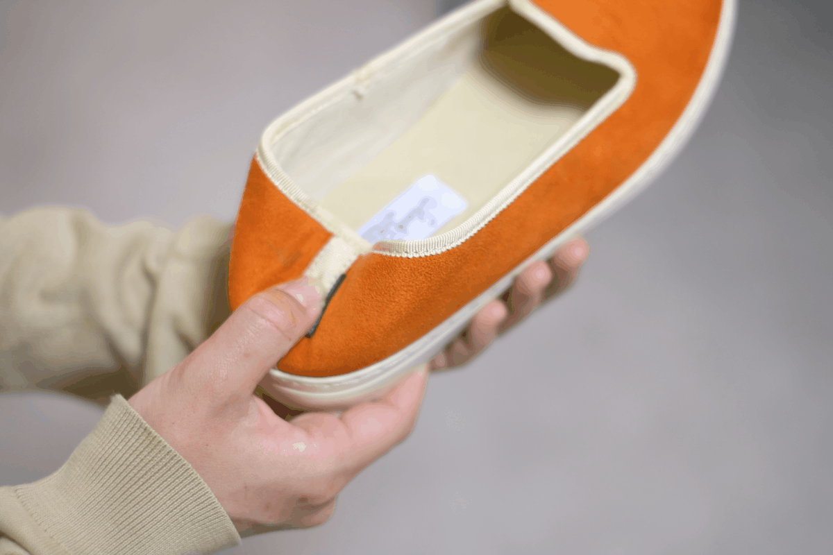 履き口にパイピングを施し、素足で履いても摩擦を抑えられるように配慮しています。