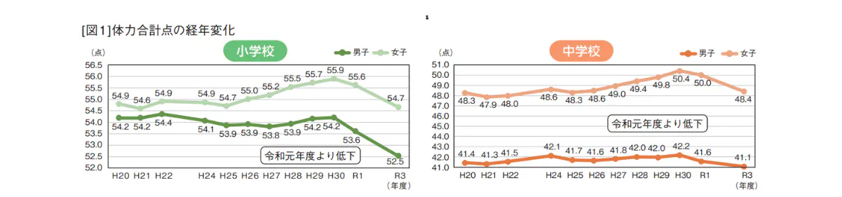 文部科学省のスポーツ庁による令和3年度全国体力・運動能力、運動習慣等調査結果によると、『体力の合計点は小中学校の男女ともに低下』とあります。残念ながら、子どもの体力は近年で低下しています。