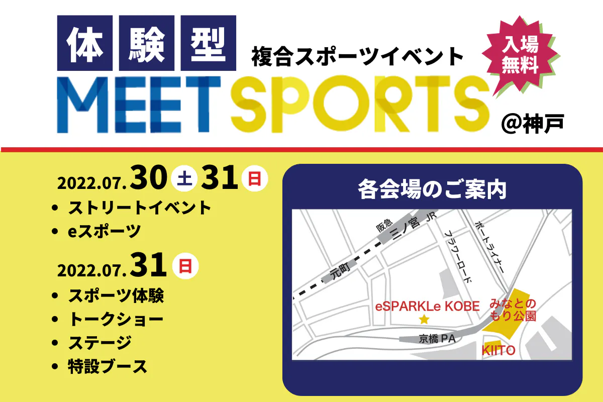 たくさんのスポーツを無料で子ども達が体験できるイベント「MEET SPORTS」を神戸三宮近郊の3会場で2022年7月30日(土)・31日(日) 2日間開催します。